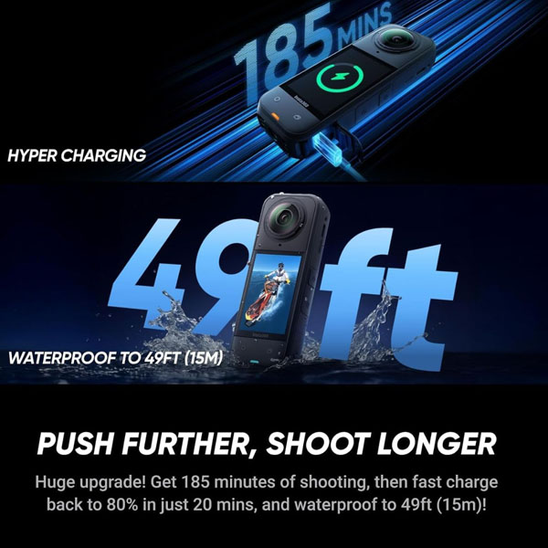 ساختار مقاوم و استاندارد ضدآب، تضمین میکند که دوربین اکشن Insta 360 X5 Standard Bundle در برابر چالشهای محیطی تسلیم نشود و همواره آمادهی ثبت تصاویر باشد. این دوربین تا عمق ۱۰ متری، کاملا ضدآب طراحی شده است و بدون نیاز به کاور یا کیس محافظ اضافی، همراه شما در زیر آب و شنا کردن خواهد بود. بدنه مستحکم این دستگاه در برابر ضربهها، سقوط و گردوغبار مقاومت بالایی نشان میدهد که آن را به ابزاری قابل اعتماد برای سفرهای آفرود، اسکی یا موجسواری تبدیل میکند. دوام بالای باتری هم به شما اطمینان میدهد که در طول یک روز کامل تصویربرداری، نگرانی از بابت از دست دادن شارژ دستگاه نداشته باشید و تمام لحظات مهم را به راحتی ثبت کنید.